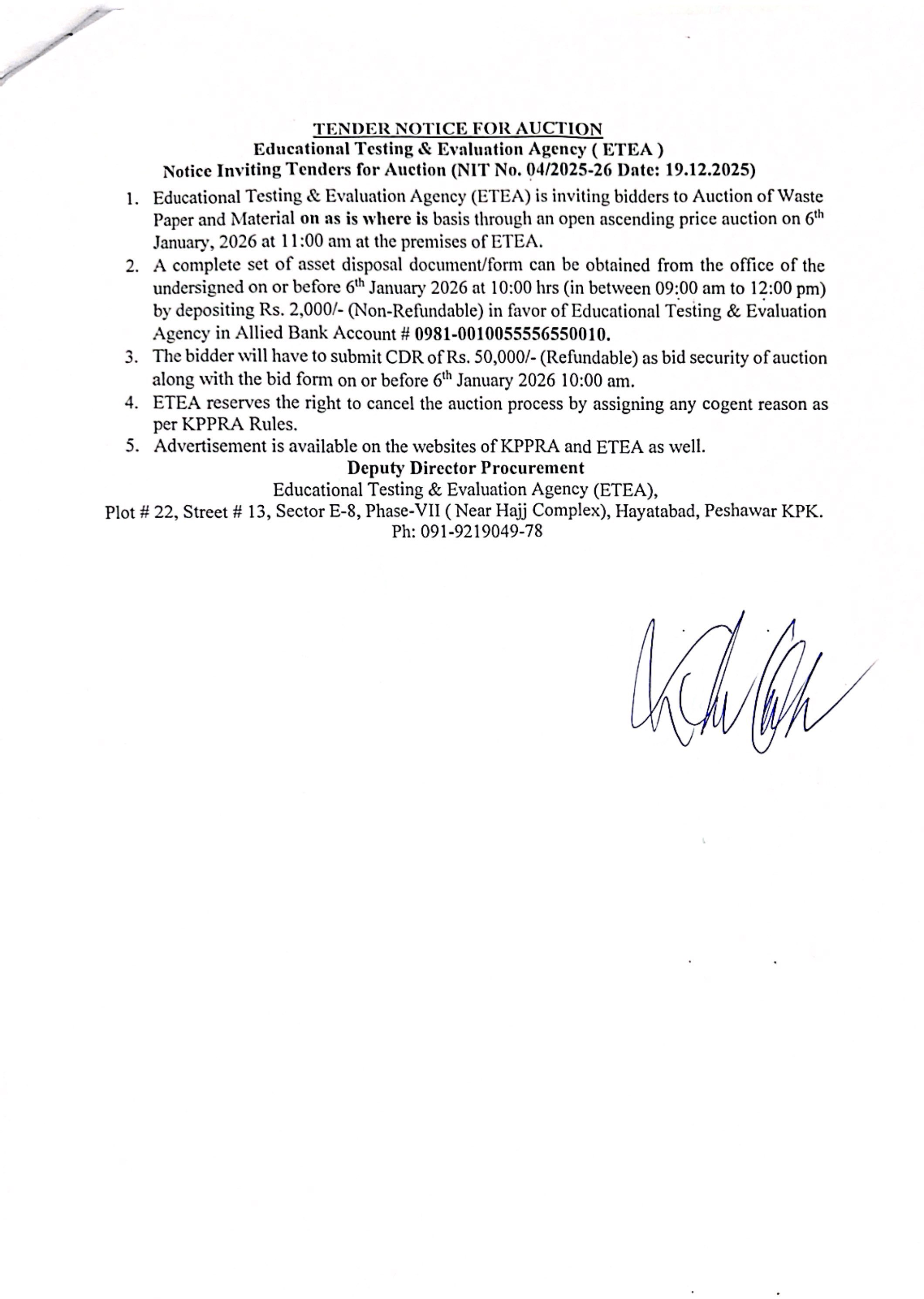 NOTICE INVITING TENDER FOR AUCTION OF WASTE PAPERS AND MATERIAL " Last Date for Submission of Documents is 6th January, 2026 10:00 AM.