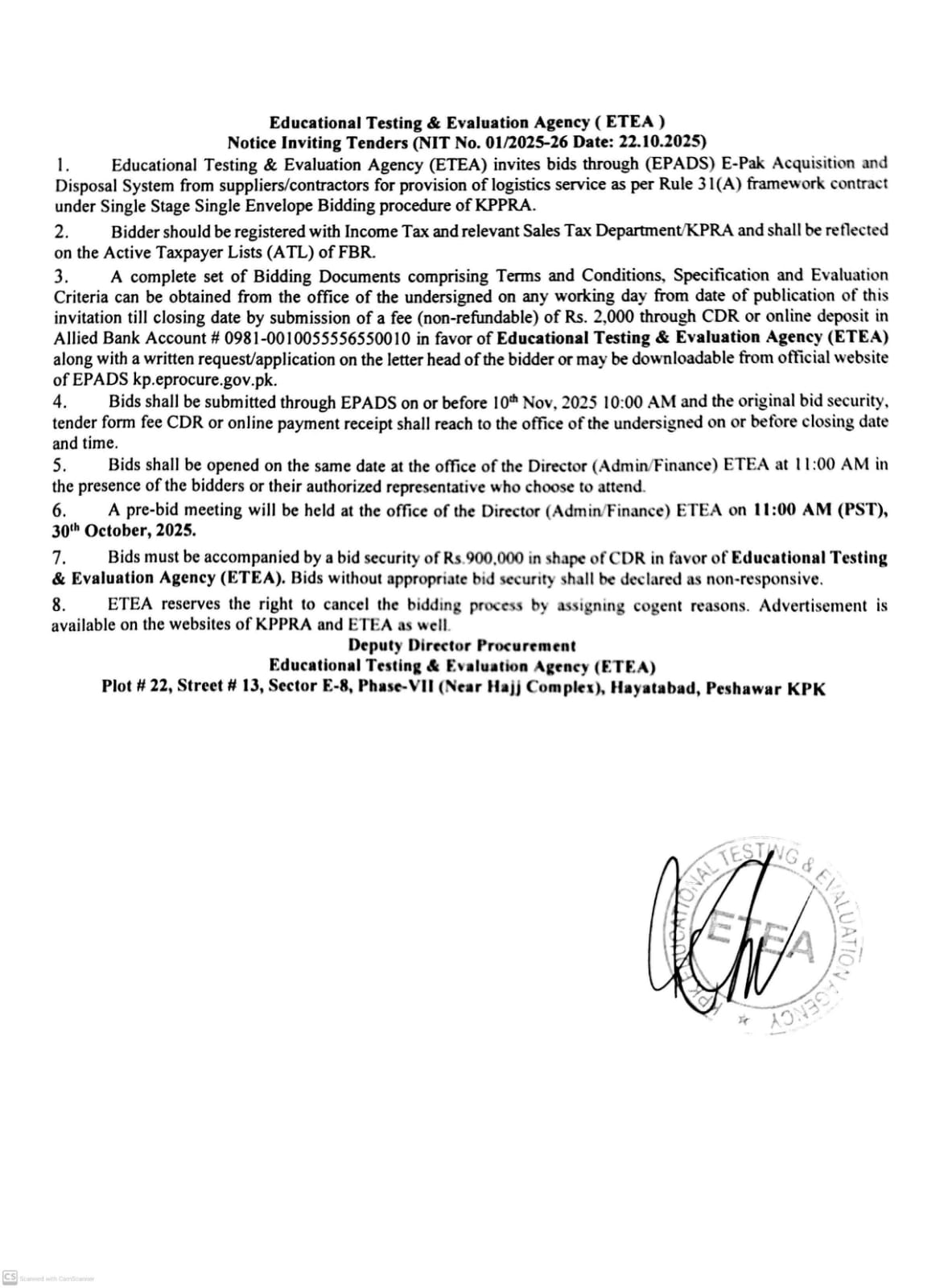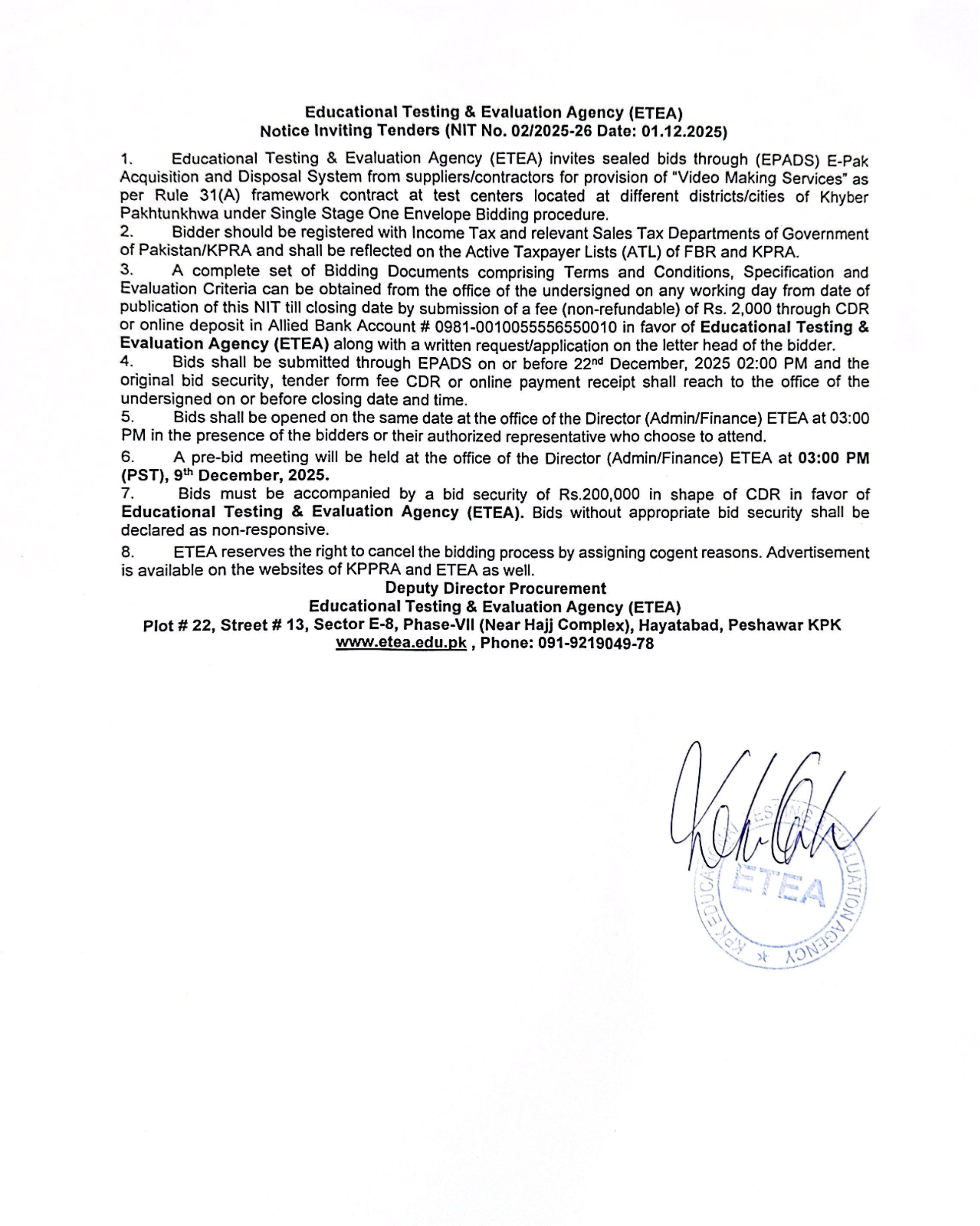 Financial Bid Opening of the technically qualified bidder against NIT No. 03/2024-25, KPPRA Tender No. 26970 INF(P)3414/24) (Supply and Installation of Surveillance System) has been scheduled on 05.03.2025 11:00am at the office of Director (Admin/Finance) ETEA